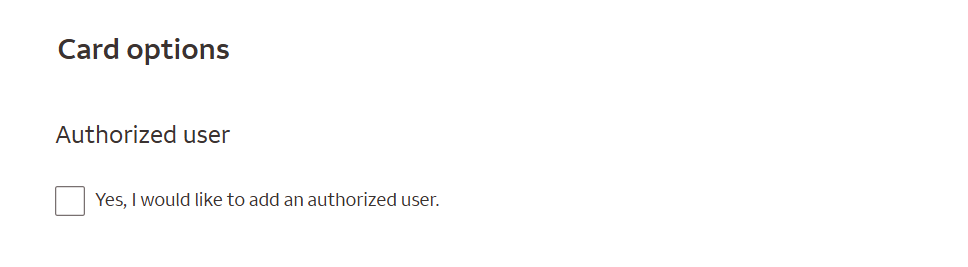 The form may also show a Card options section. In the screen you shared, this includes the option to add an authorized user. If that is not part of your plan, you can simply leave it unchecked and continue.